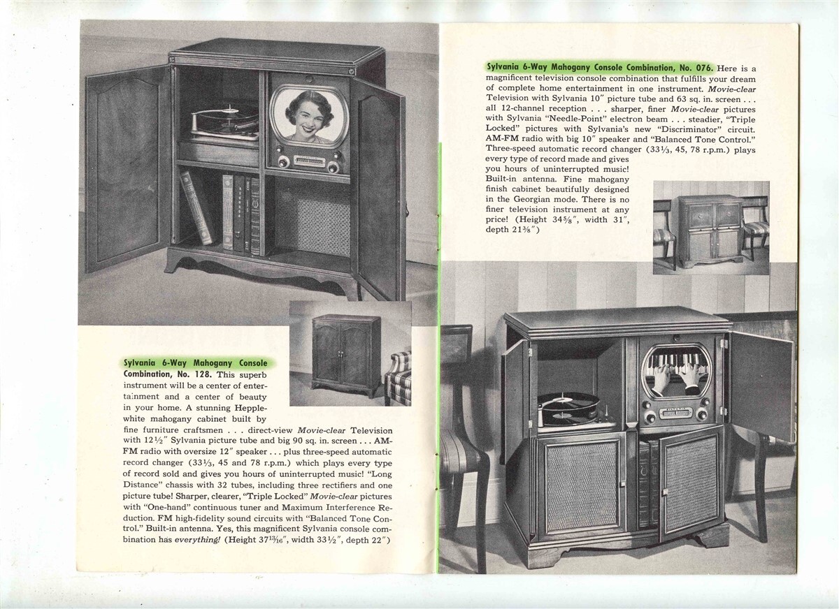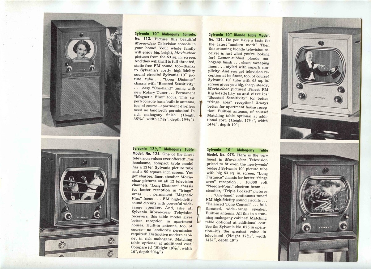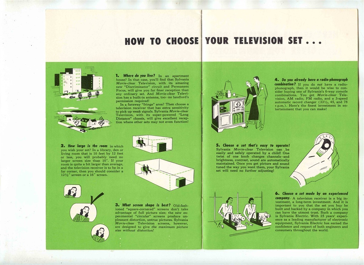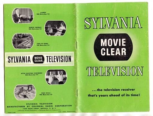 A well illustrated 16 page booklet. With photos and detailed information on many models of Television Sets. How to Select a TV Set and more. 1949 Sylvania Movie Clear Television Brochure . Manufactured by the Colonial Radio Corporation of Buffalo New York.