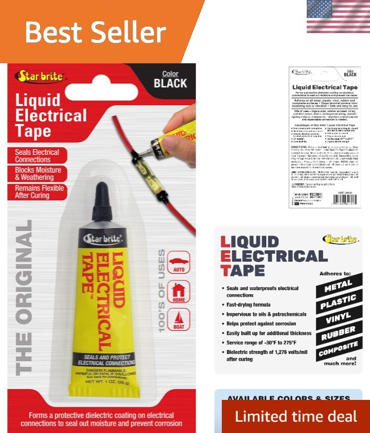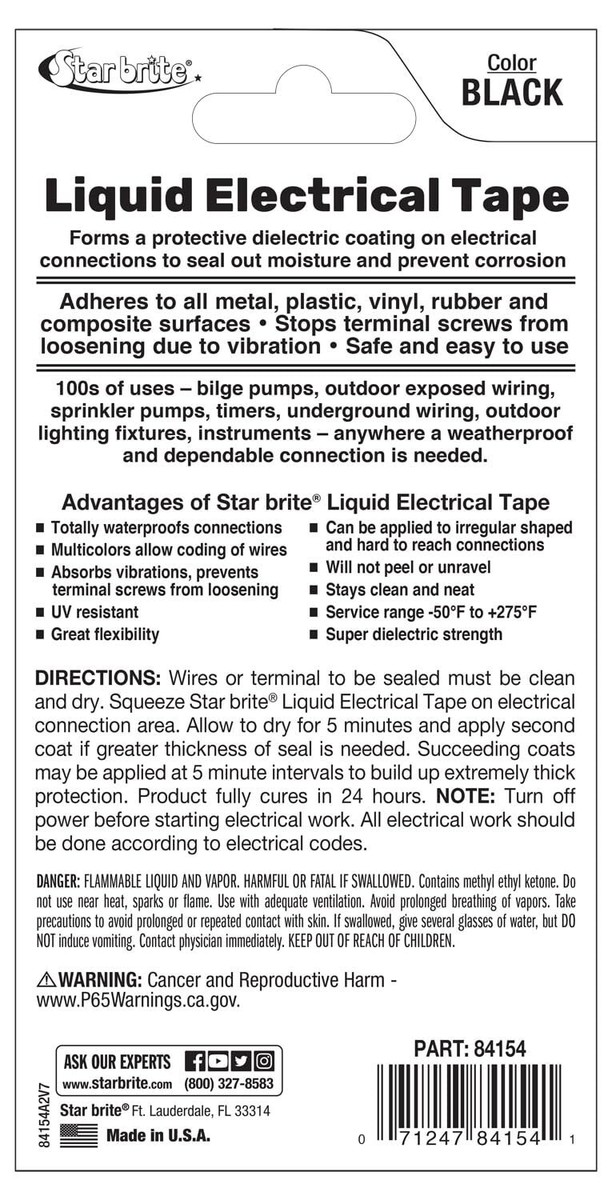 Introducing Liquid Electrical Tape, available in both 4-ounce cans and 1-ounce tubes, designed to meet all your electrical sealing needs. Superior to electrical tape, it adheres to metal, plastic, vinyl, rubber, and composite surfaces, creating an airtight, protective, waterproof, UV-resistant, dielectric seal. The 4-ounce can comes with an applicator brush cap, while the 1-ounce tube features an integrated precision applicator tip, ensuring smooth and exact application, making your tasks easy mess-free. This product stops terminal screws from loosening due to vibration and offers a service range of -50F to +275F. With 100's of uses, including bilge pumps, outdoor wiring, sprinkler pumps, timers, and more, it's perfect for anywhere a weatherproof and dependable connection is needed. 's patented, fast-drying formula provides great flexibility and super dielectric strength. Multicolor options allow wire coding, and the product stays clean and neat.