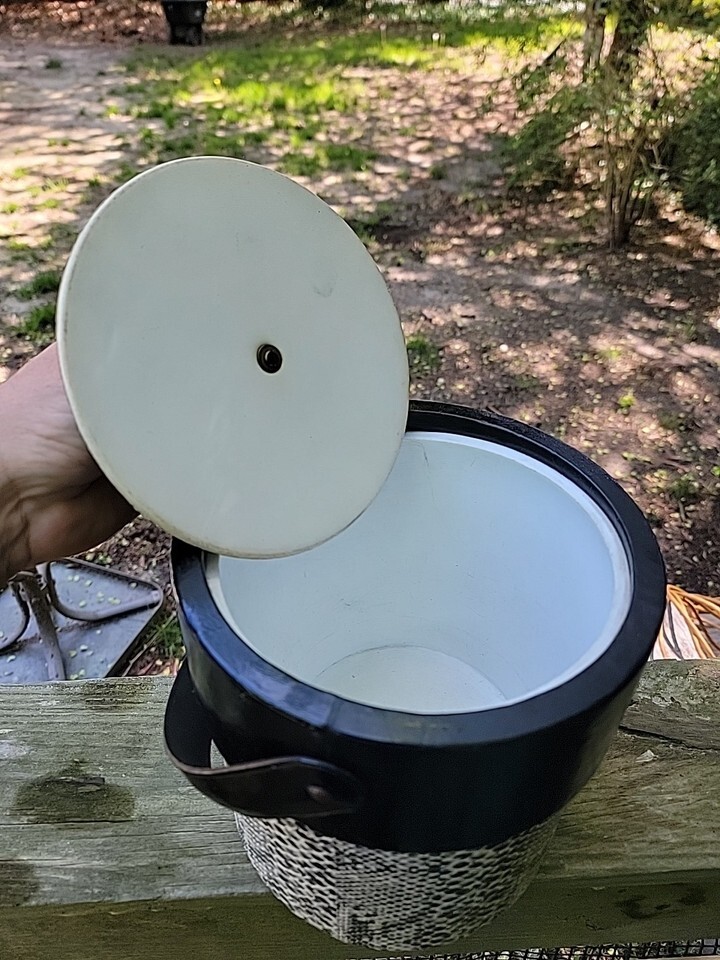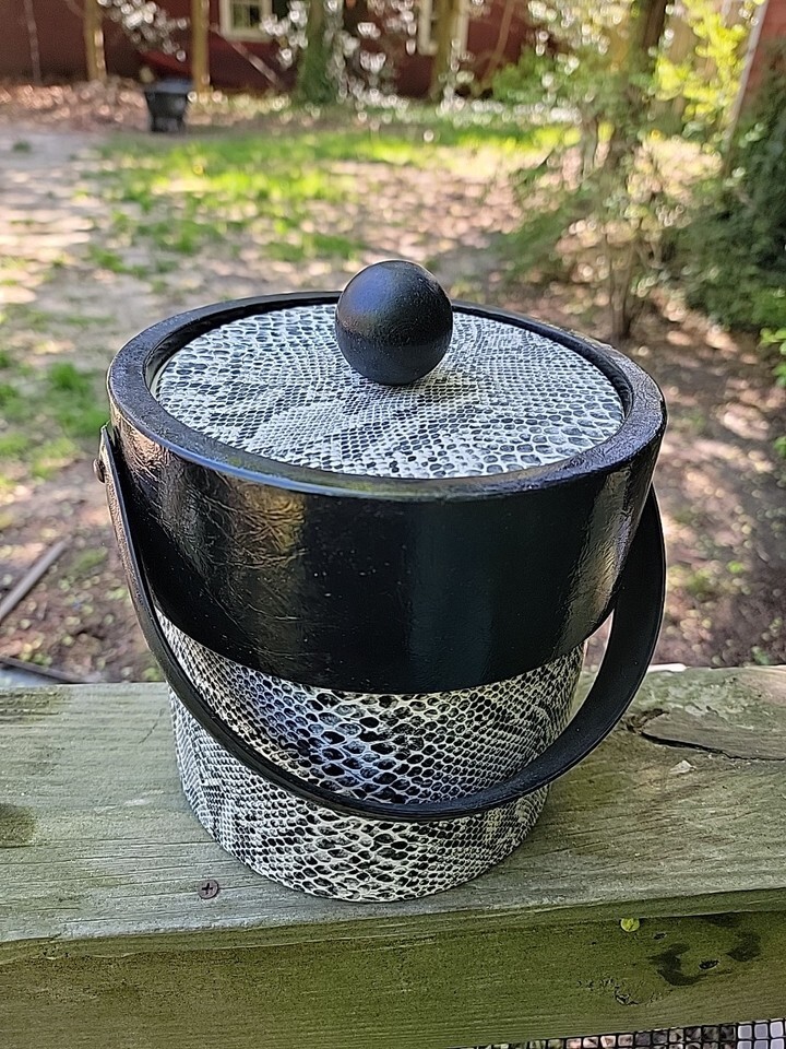 MID CENTURY VINYL BLACK & WHITE SNAKE SKIN ICE BUCKET WITH LID ~ MCM 1960's