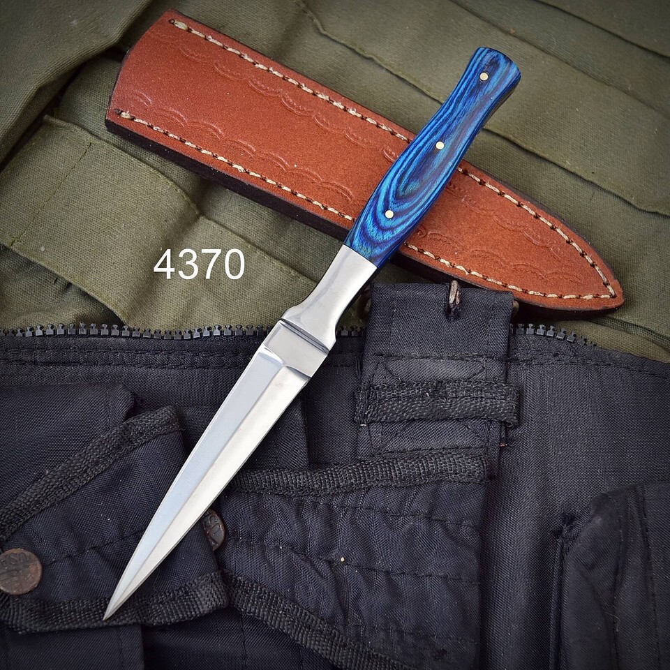 8.5" overall. 4" satin finish double edge stainless dagger blade wood handle. belt sheath. Boxed.