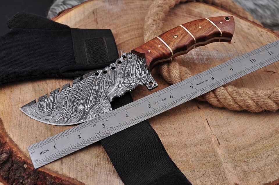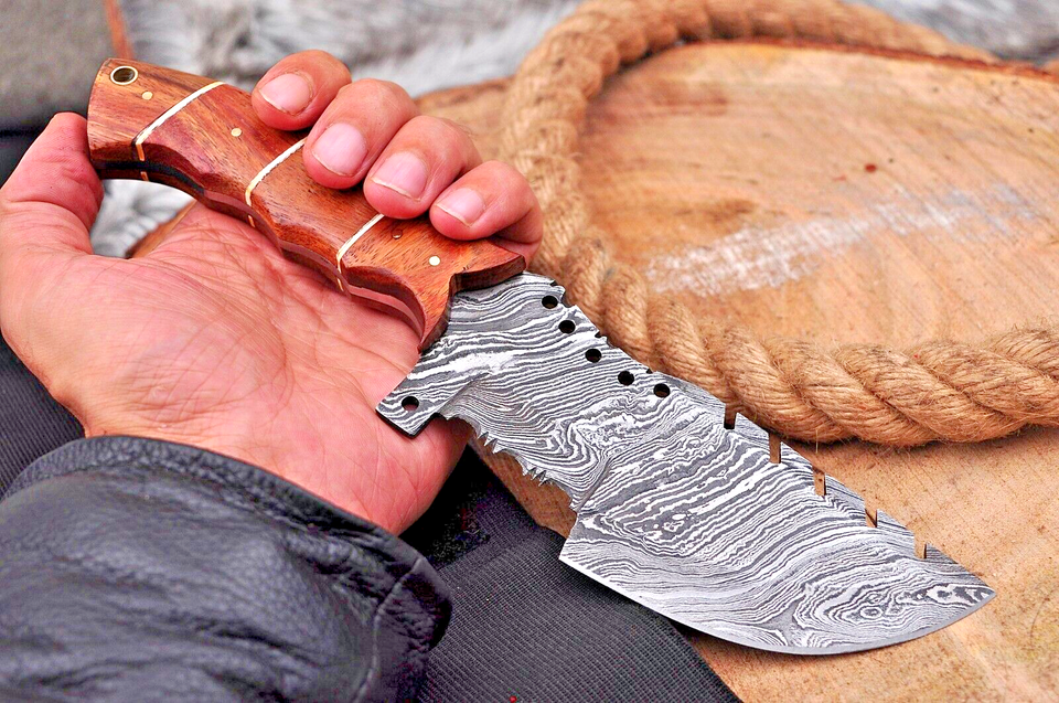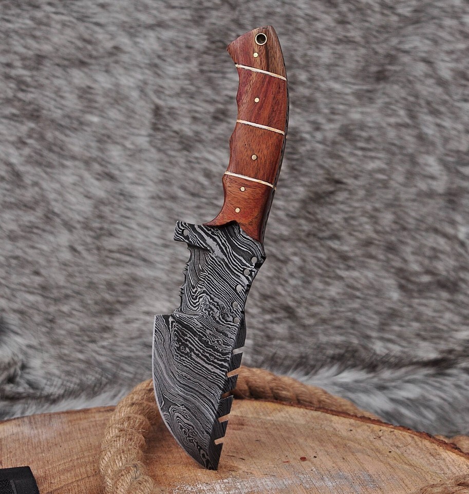 Blade of this knife has a nice file work and is made of 512 layers of 4340 stainless steel and 1075 high carbon steel and hardness 55-58 HRC . This robust knife is lab tested under intense conditions, the balance and shape of this knife ensures perfect grip.