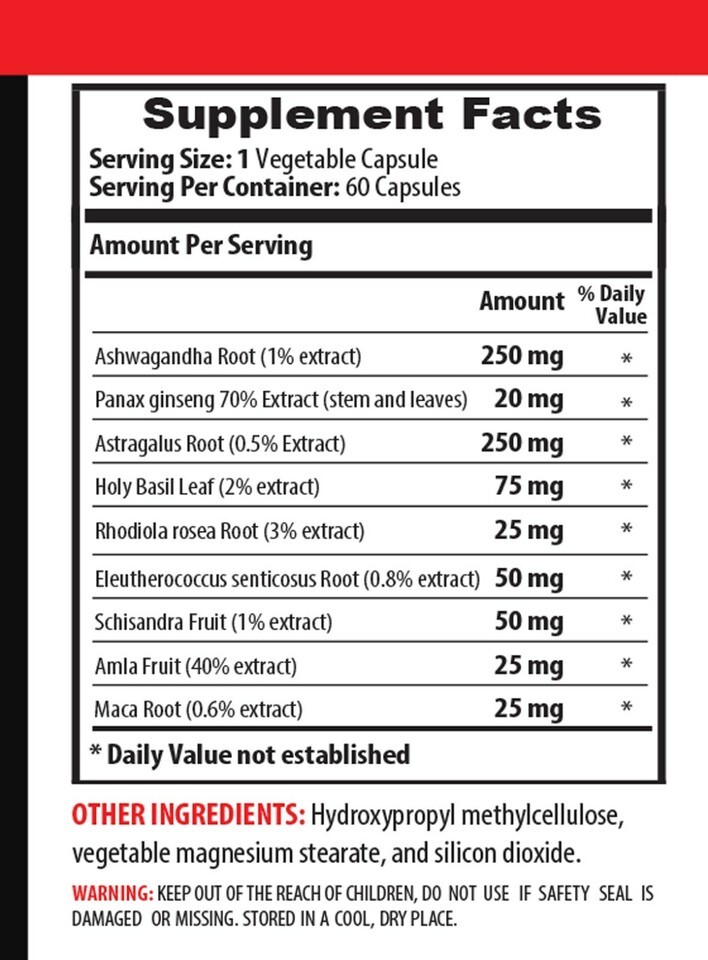With: Ashwagandha, Panax Ginseng, Maca Root, Rhodiola.