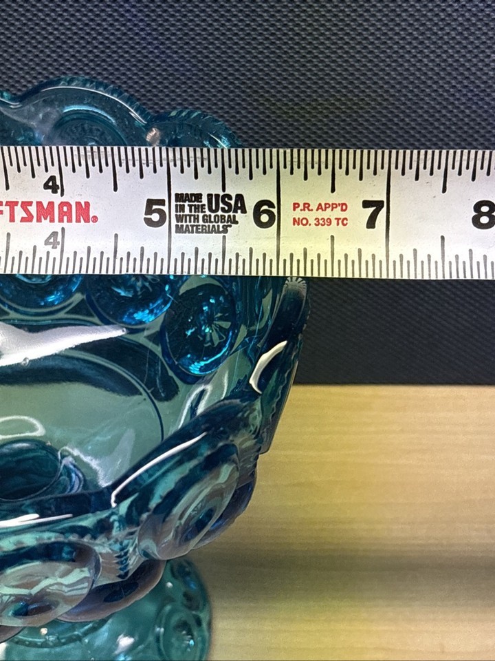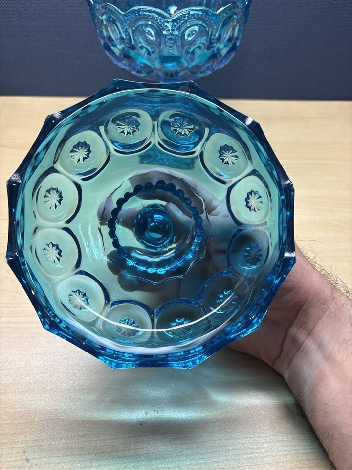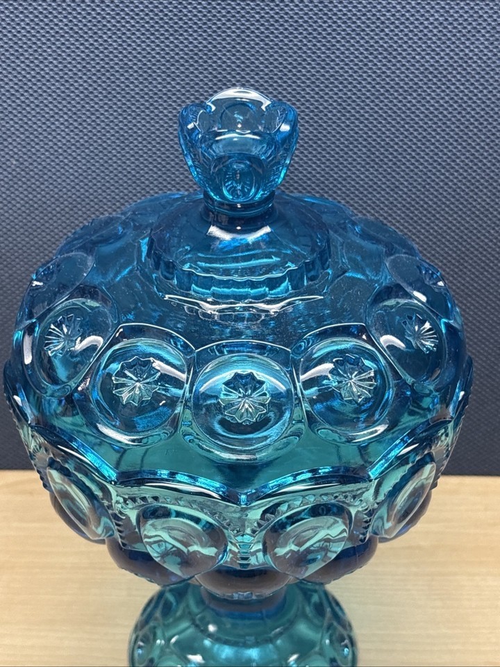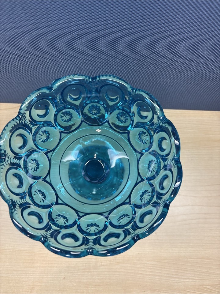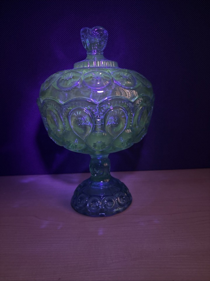 Vintage LE Smith Moon Stars Covered Compote 10" Blue Iridium Glass Lid Candy. This one glows pretty good under black light. Check pictures before purchasing.