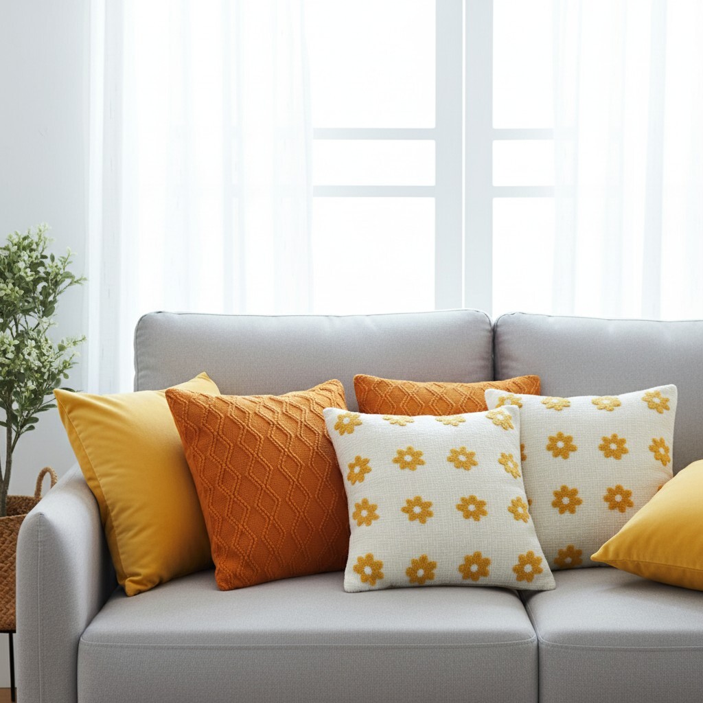Warm Vibrant Colors: Golden velvet and burnt orange paired with retro daisy patterns create a lively and cozy décor accent.