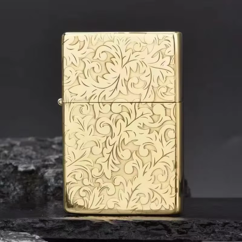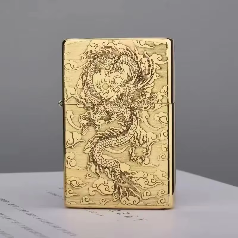 Brass Thin Double Sided Carved Windproof Kerosene Pocket Lighter Vintage Look