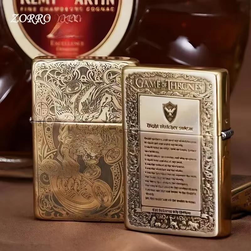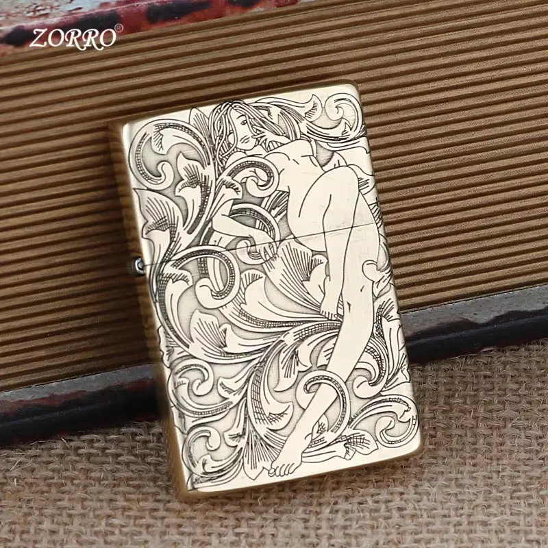 ZORRO Brass Ultra Thin Double Sided Carved Windproof Kerosene Lighter Vintage Grinding Wheel Ignition Unusual Lighters Smoking
