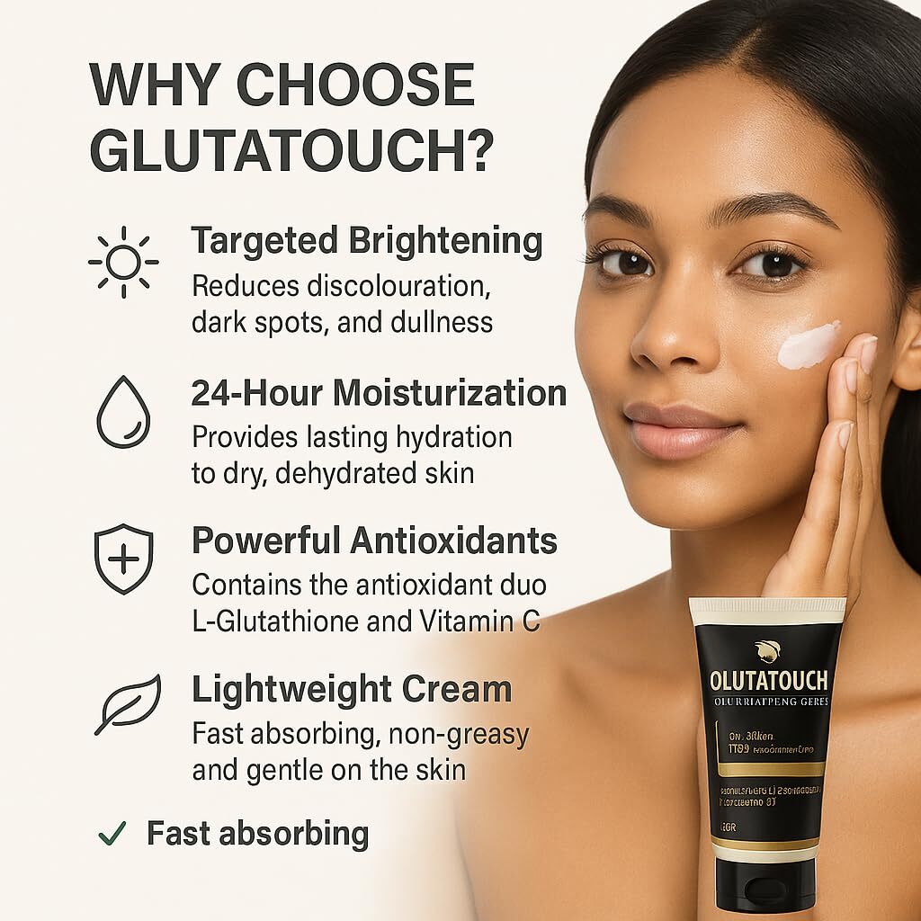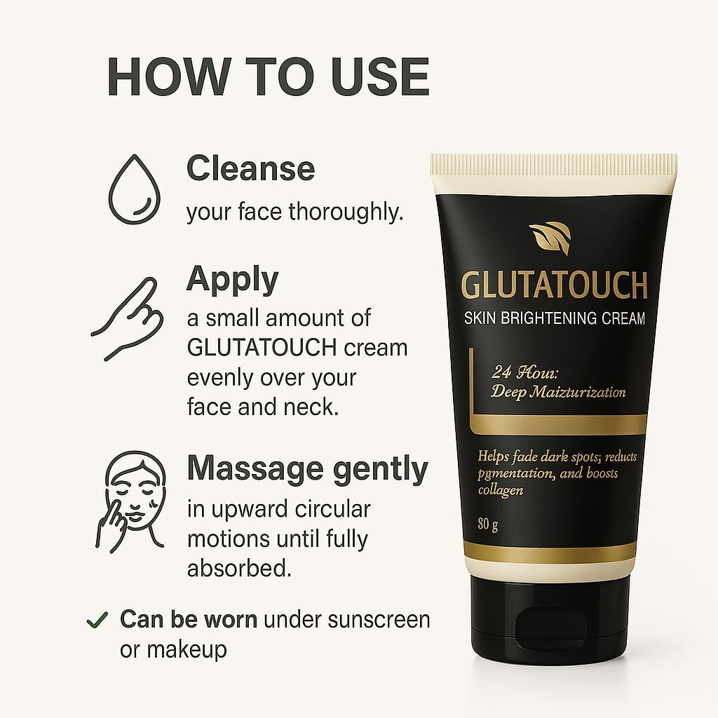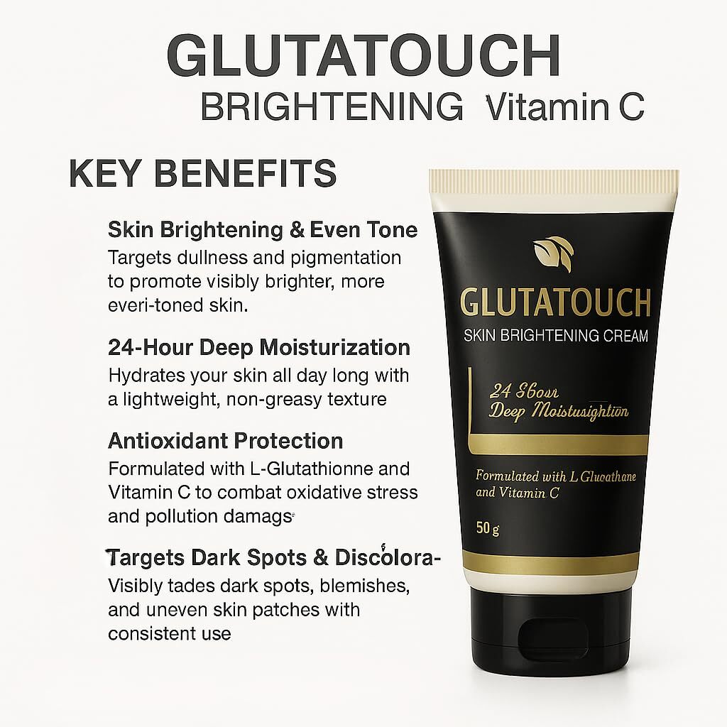 GLUTATOUCH Skin Brightening Cream is meticulously crafted to enhance your skin's radiance and reduce the appearance of dark spots, uneven tone, and dullness. Infused with powerful ingredients like Glutathione, Vitamin C, and Kojic Acid this cream works synergistically to brighten and rejuvenate your skin, unveiling a more luminous and even complexion.