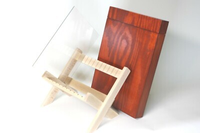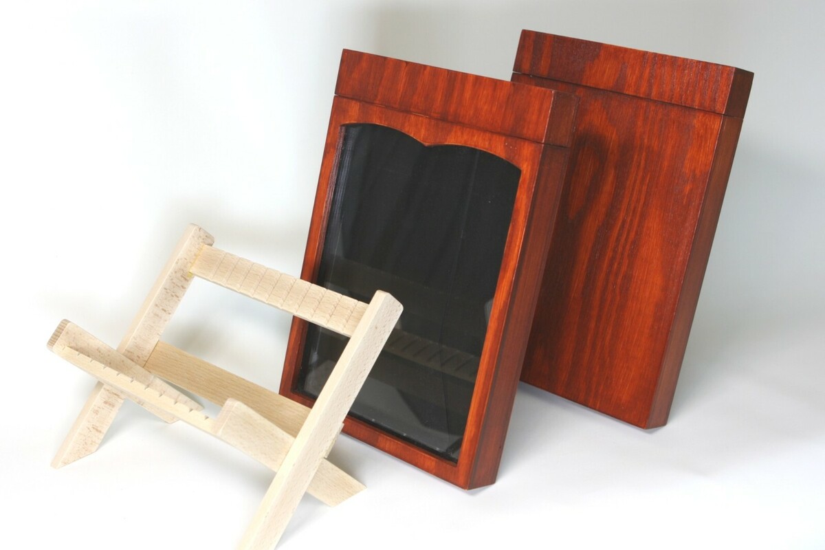 This is brand new handmade Wet Plate Collodion 8x10 Kit. This kit contains: Silver Bath box with dipper, Fixer Bath box with dipper and Plate Rack. Both inner bath boxes are made of PVC-FF (black color), which is absolutely inert towards all related chemical solutions. The front plate of the fixer bath box is made of plexiglass. Both inner bath boxes are fully removable from the outer wooden containers for easier cleaning and manipulation. Both dippers are made of hard black PVC material, which is absolutely inert towards all related chemical solutions. Both outer containers are made of beech and pine wood and finished with 4 coats of lacquer gloss paint (mahogany color). Both containers are hinge covered and provided with back bracket for fixation of the bath boxes in optimum inclined position. The plate rack is made of beech wood and is optimized for holding 10 plates at one time. Empty plate rack can be folded. The whole kit and all its components are optimized for 8 x 10 in plates. Inner dimensions of each bath box are 290 x 205 x 18 mm (11,5 x 8,1 x 0,7 Inches). Each bath box with its container weighs 1300 g (46 oz). The bath box is optimized for the use of approximately 850 ml (28 US oz) of the Silver nitrate solution. 850 ml of sensitizing solution (silver nitrate) can be used to sensitize circa 100 plates (8x10 in).