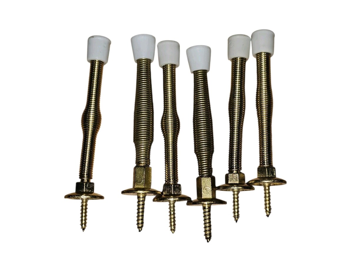The product is a set of 6 3" bright brass finish light duty spring door stops from the brand Everbilt. These door stops are compatible with all universal door brands and feature a screw-in installation for easy mounting. Made of brass and rubber, they provide a stylish and practical solution for preventing doors from slamming shut. The brass finish gives them a sleek and elegant look, while the spring design ensures they provide a gentle cushioning effect when the door stops them. These door stops can be mounted on the wall or door, making them versatile for various home decor styles.