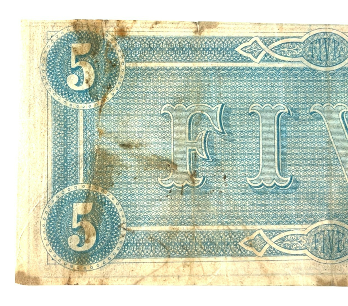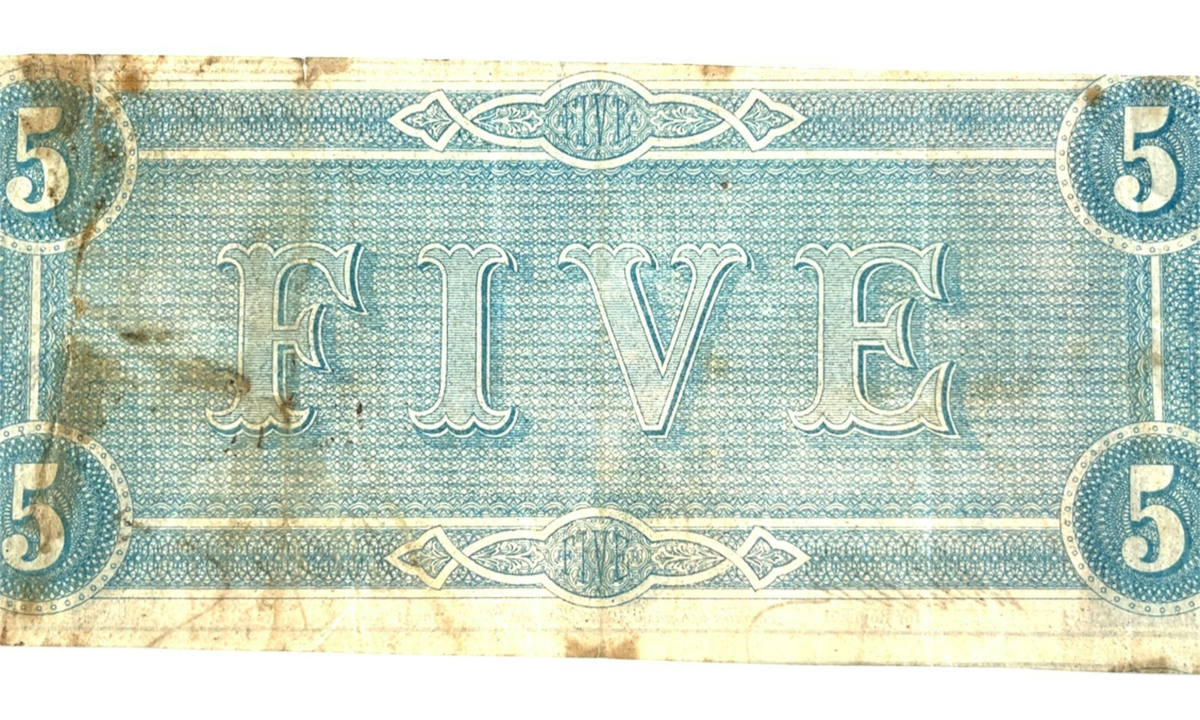 Condition Notes: Uneven margins. Some edges are rounded with minor creases. One major vertical fold. Minimal creases. No rips, tears, or losses. Discoloration and yellowing from age and use. Major stain on the back and front of the note. Most writing is visible and readable. No graffiti or pinholes. No stamps on the bill.