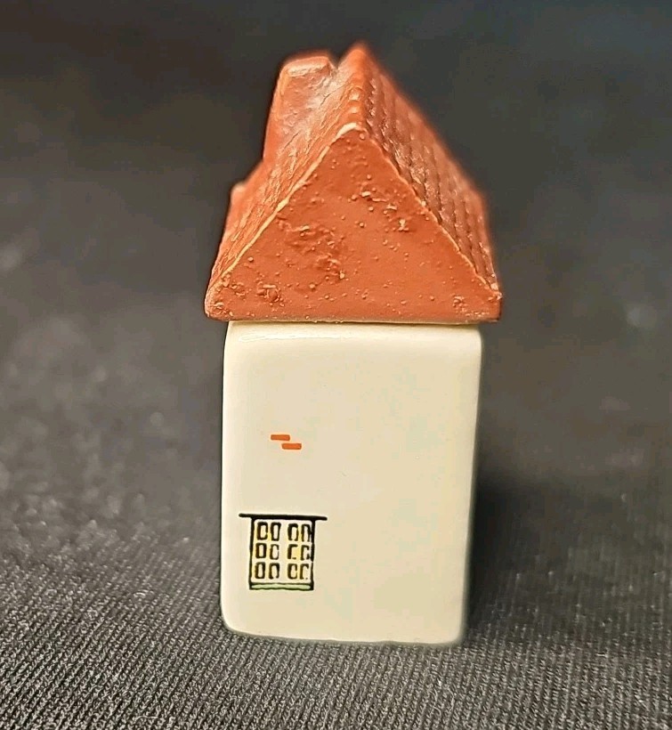These charming ceramic miniatures were made in Ireland by Wade and are known for their hand-painted details and whimsical cottage designs. This piece features a cream-colored house with a textured brick-style roof, green door, and painted window details ? a classic example of the Whimsey-on-Why series.