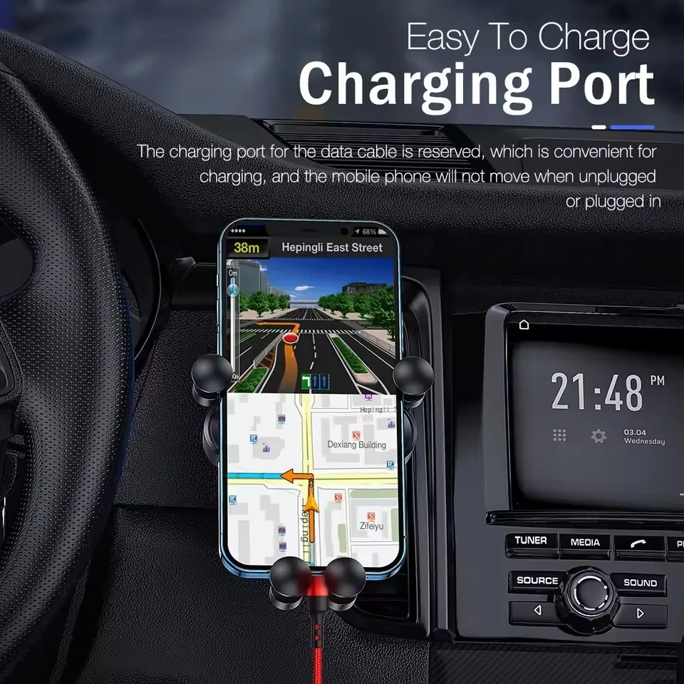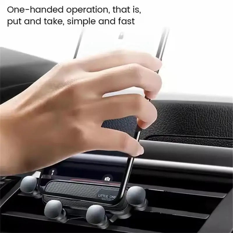 This gravity car phone holder mounts securely to your air vent and automatically locks your phone in place using its smart gravity clamp design. No buttons or magnets needed — just place your phone in the holder and the arms tighten for a stable grip. Ideal for navigation, hands-free calls, and everyday driving.
