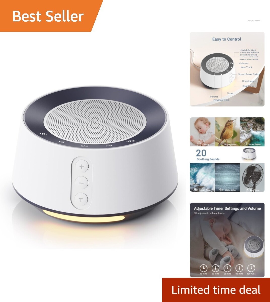 20 Soothing Sounds: Enjoy a diverse range of calming audio options, including 4 variations of white noise, 4 machine sounds (Fan Noise, Sleep Fan Noise, Clothes Dryer, Washing Machine), 8 nature sounds, and 4 delightful lullabies.