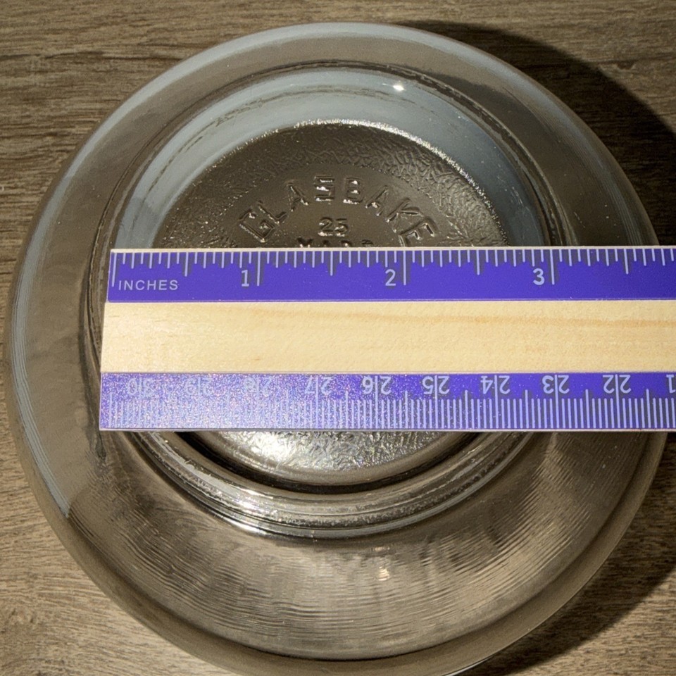 The Vintage Glasbake Sunbeam 3 Qt Clear Glass Mixing Bowl is a large, original piece from the 1940s-1960s era. With a capacity of 3 quarts, this lightly scratched bowl is a collectible kitchen tool that is both functional and stylish. Made of glass, this mixing bowl is perfect for any retro kitchen enthusiast looking to add a vintage touch to their collection.