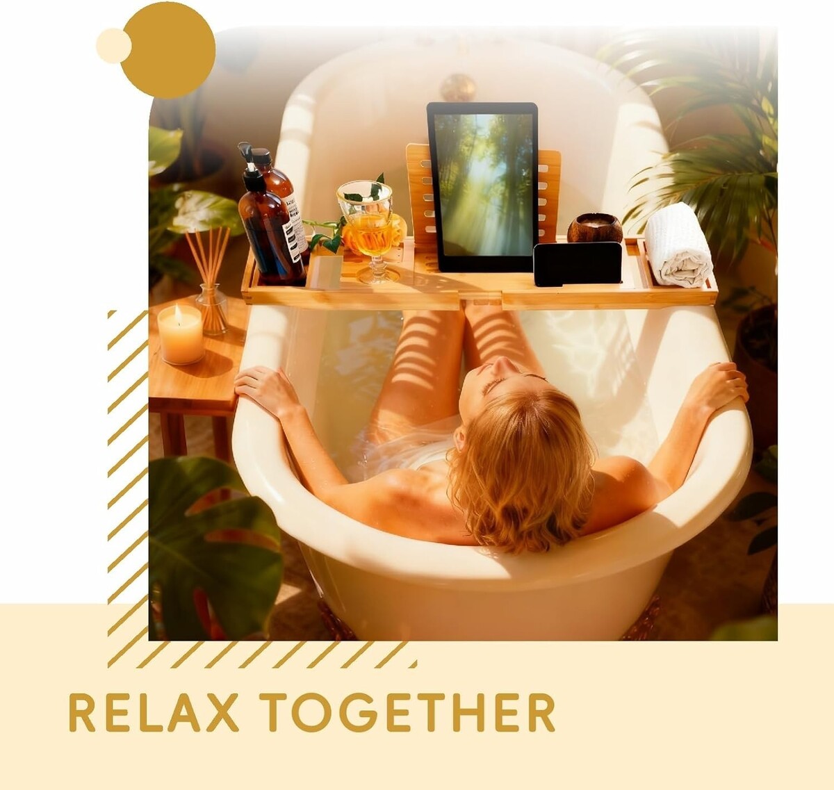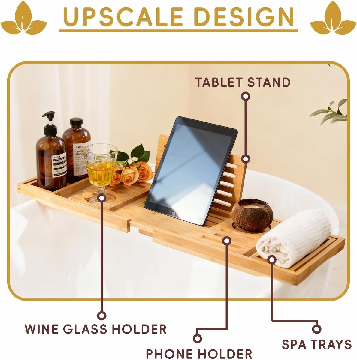 Dedicated holders for your wine glass, tablet, book, phone, and a special hook for bath accessories.