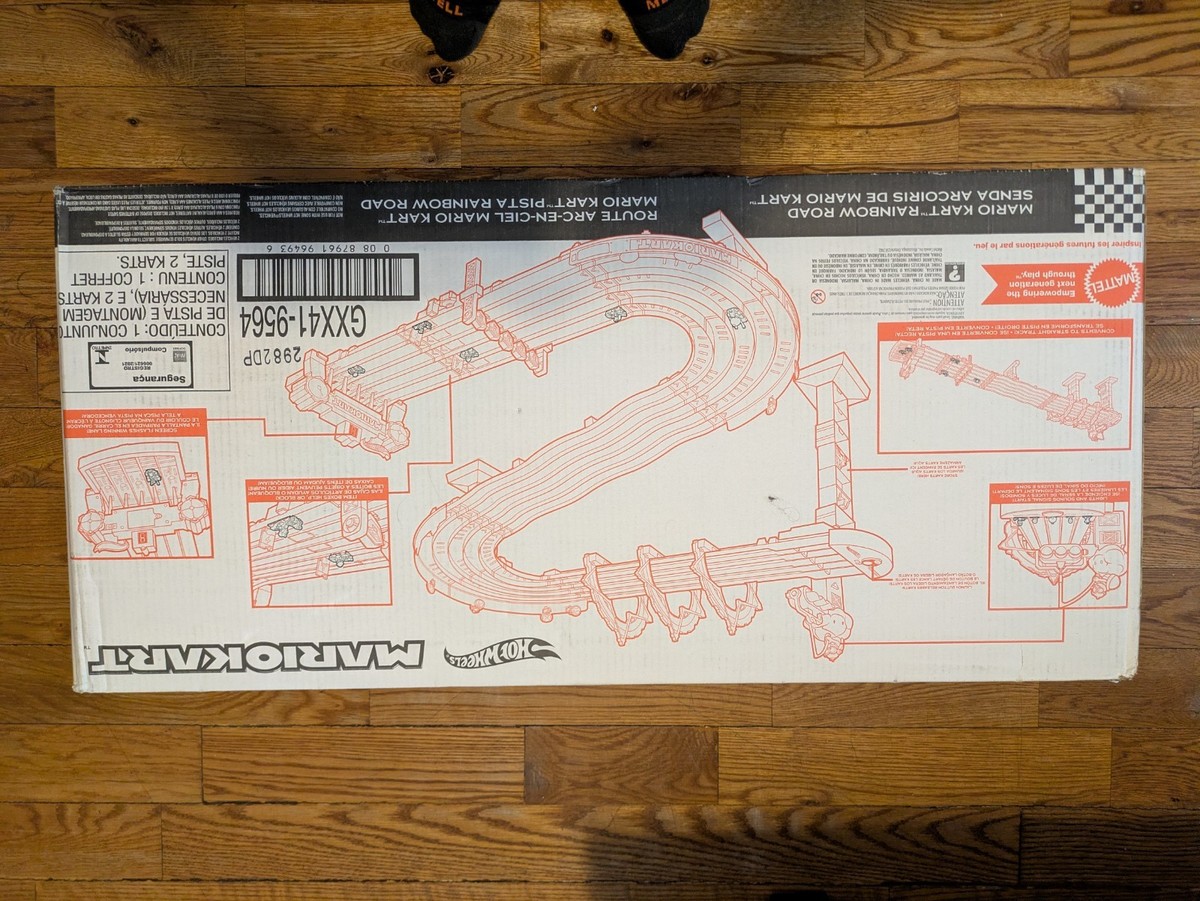 Brand new, unopened Hot Wheels Mario Kart Rainbow Road track set. Comes packaged with two Hot Wheels die-cast cars: (1) Mario Standard Kart and (2) King Boo Standard Kart. See images for condition of external box packaging.