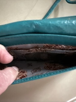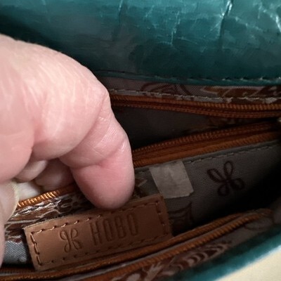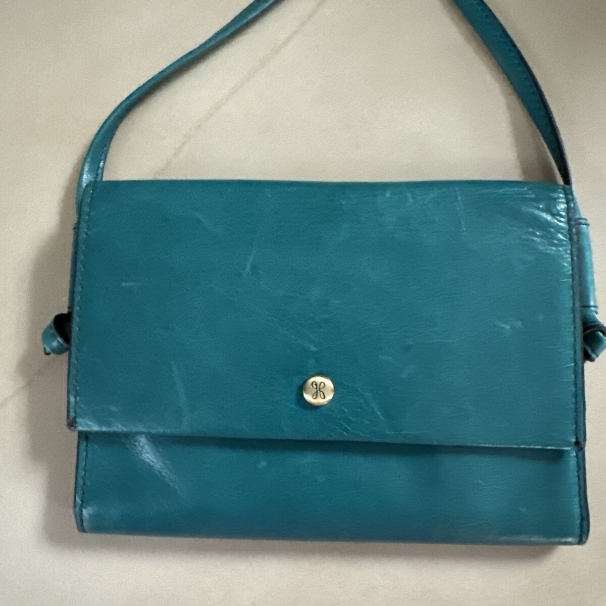 Hobo International purseCrossbodyFine leather most beautiful GREEN/TEALPattern Solid7"w x 5"h x 1"24" strapSignature fabric liningLots of organization slip pocketsopen pocket on the backsnap closure 3 CC slip pockets1 interior zipper closure pocketlarge slip pocket with clear ID slotMy large 14 pro max iPhone fits in perfectlyEXCELENT PRE-OWNED CONDITIONINSIDE CLEAN AND PRISTINE