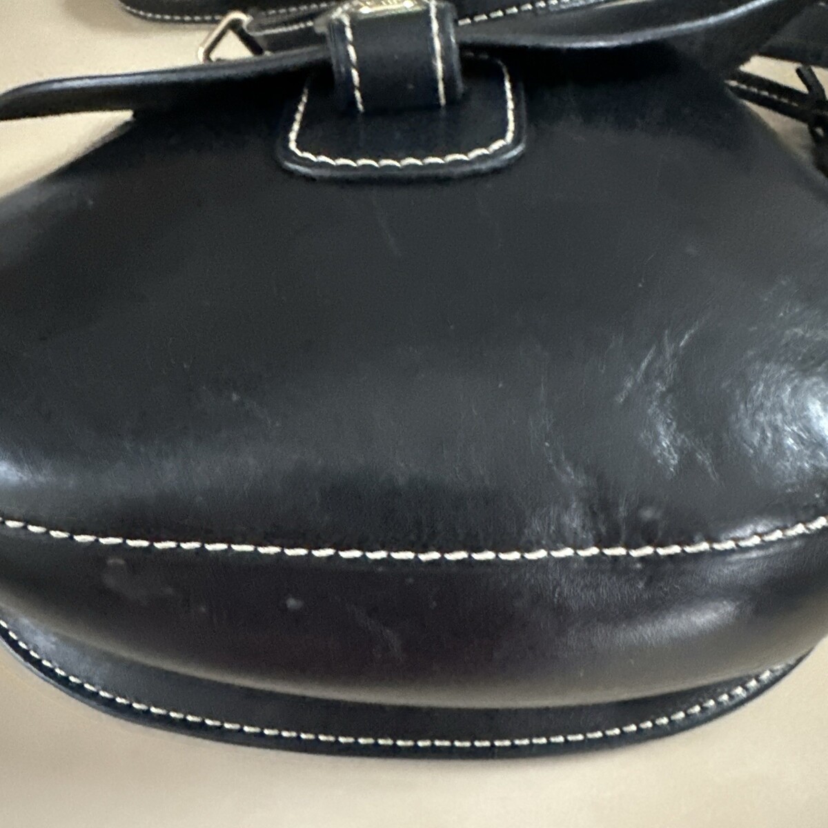 The strap no usage or wear. White stitching is still white not discolored or dirty