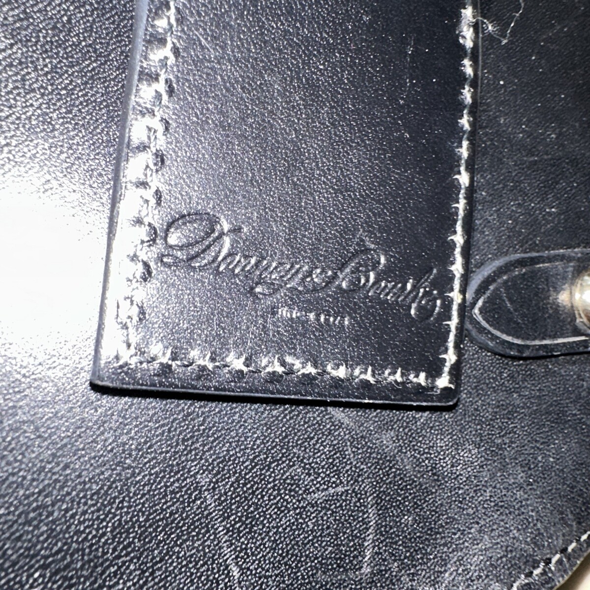White label was stuck on the inside of Purse I have not tried to take it off. I thought the buyer would I believe this was a sample purse. It has no sign of use or wear at all. Inside is brand new and outside some minor finger scratches I have totally cleaned and conditioned the leather. Like new condition.