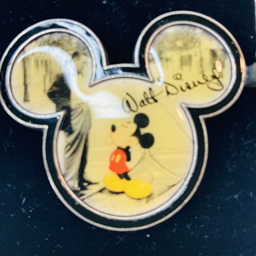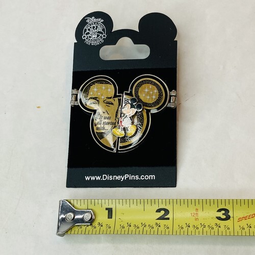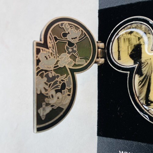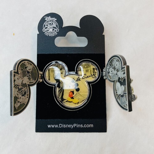 This is a heavy pin with Walt Disney on the front. Open the hinges with Mickey Mouse to reveal photos of Mickey Mouse from the start. Really cool and great gift!
