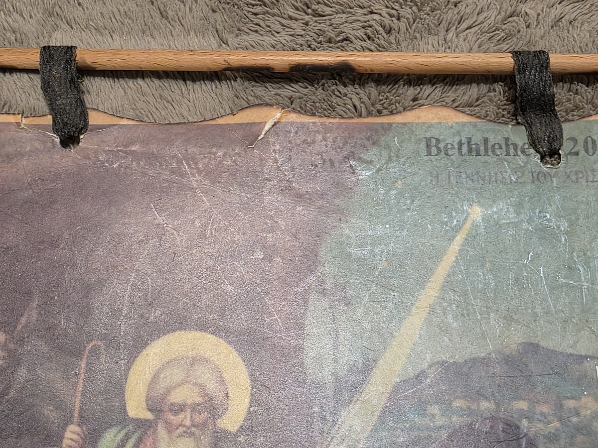 Offered @ W.D.A. Is a large hanging decal depicting the Birth of Christ......this item's impressive art has attracted it to the store..... ....upon casual observation appears to be of Russian.Origin.........but please!...... even if ur only window shopping email [email protected] for polite correction of provenance!............must ship hardbox.......THANKS! value undetermined so priced accordingly...... welldressedattic.