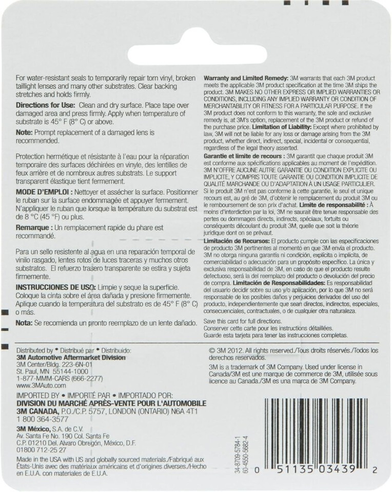 The product is a 3M Auto Clear Repair Tape model 3M 03439, designed for automotive use. This tape is 1-1/2 inches wide and 115 feet long, ideal for sealing and repairing auto parts. Made in the United States, this adhesive tape is reliable and high-quality, ensuring a strong and secure bond for your repair needs.