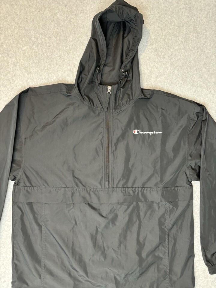 Vintage Black Champion Windbreaker With Hood Quarter Zip With Pockets Large