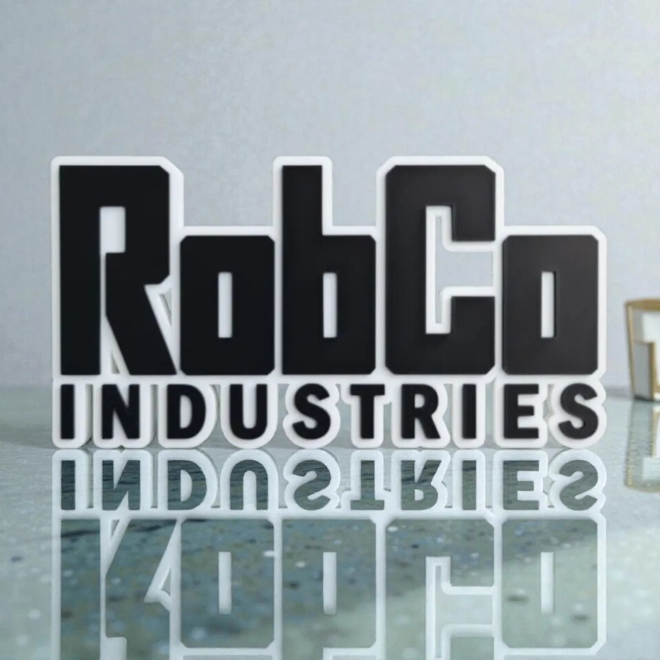 Show off your love for the Fallout universe with this detailed RobCo Industries logo sign. Perfect for any game room, desk, or collector's shelf, this display piece is crafted with a 3D printed design that captures the iconic in-game branding. It features the classic black and white block lettering, creating a striking visual that stands out. This sign is a must-have collectible for any fan of the popular video game series and makes for a unique gift.