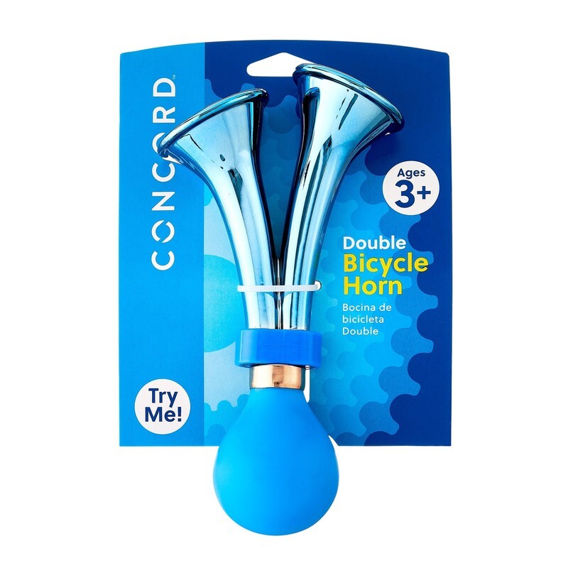 Concord Double Bike Horn is easy to install on handlebars No tools needed Squeeze for twice the fun Vacuum-metalized horns Blue color works for most any bike Fun way to be heard and notify others Also available in pink Check out all the bike accessories from Concord Bikes 0.2 lb, SKU # 4745