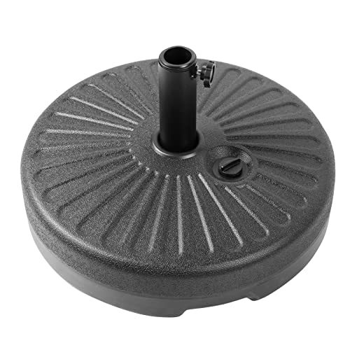 Product description: Create a strong foundation for your patio umbrella with this fillable umbrella base. Fill with water or sand for a strong and stable base. Empty it for easy lightweight storage. The adjustable tightening knob accommodates most umbrellas and locks them in place even during high winds and rain. The Circular base provides stability and style for your deck, garden, or patio. Use day or night, with solar-powered lights, no electricity or power cord is needed, with 24 LED lights last for 7 hours. With ON and OFF switch for solar lights with the solar panel on top powered by the rechargeable battery. Adjustable Tightening Knob. Weather Resistant, Durable, and easy to maintain. High-Quality Plastic Material. Simple Storage. Lightweight when empty. Easy to Assemble