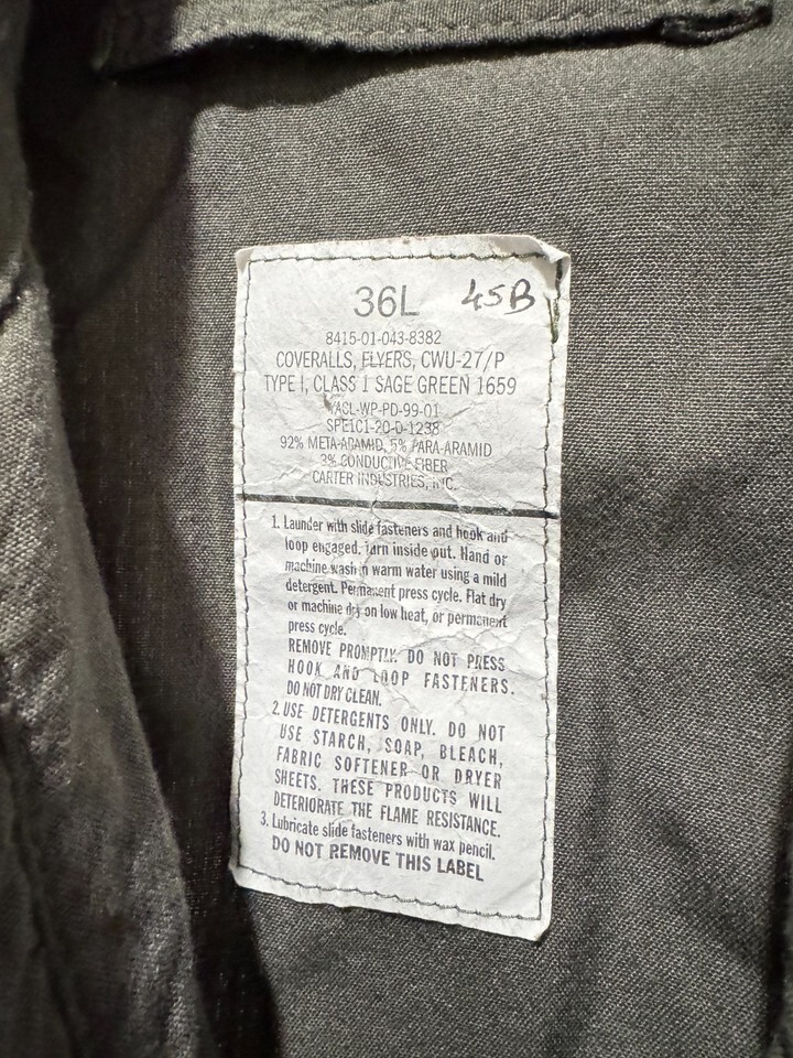 GENUINE US AIR FORCE GREEN NOMEX FIRE RESISTANT FLIGHT SUIT CWU-27/P - 36L.