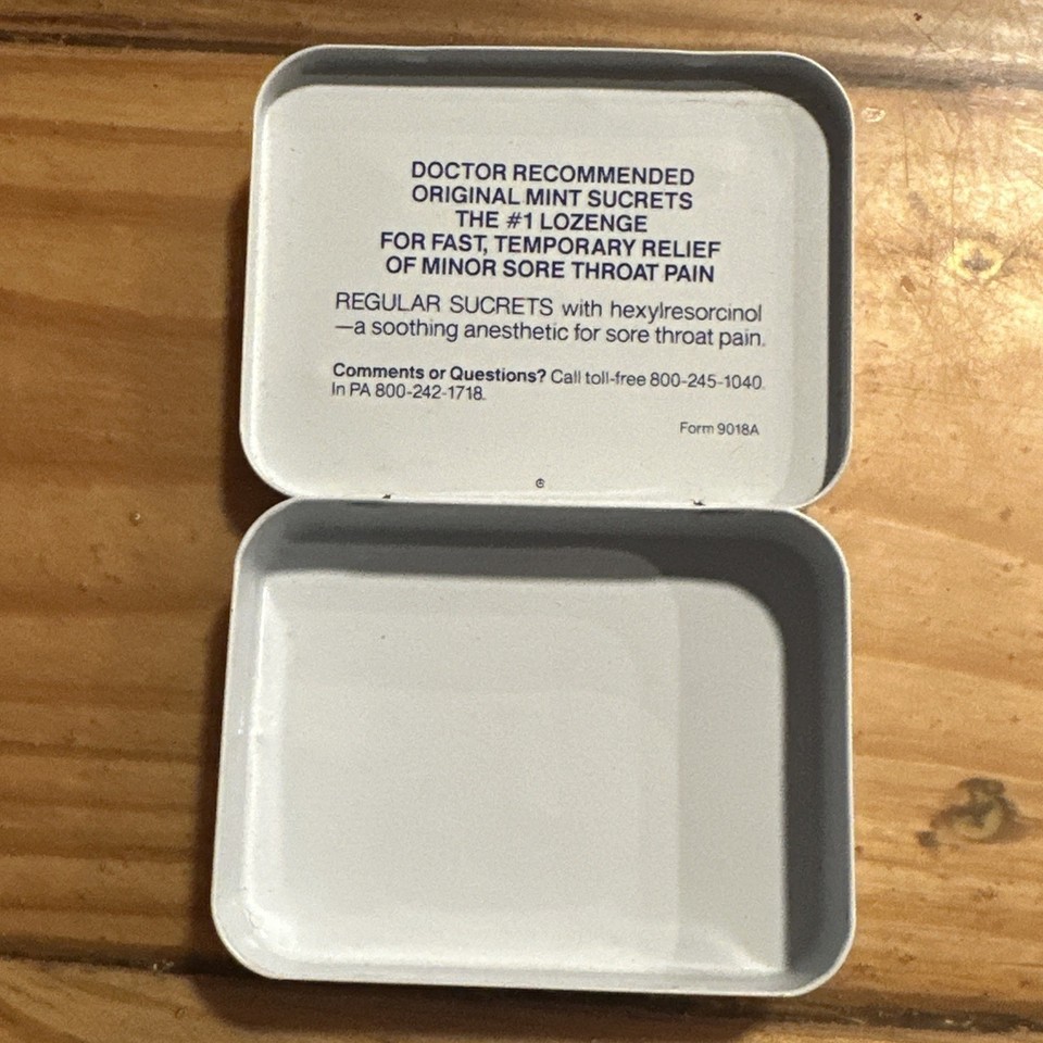 The product is a vintage empty Sucrets tin box in original mint color. This collectible advertising piece features the Sucrets brand and is associated with the theme of medicine and first aid. Made in the United States, this tin box is a nostalgic piece that would be a great addition to any vintage collection or display.
