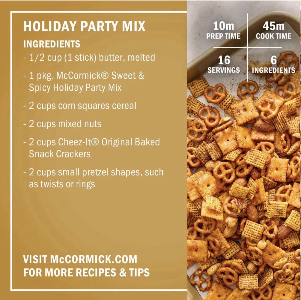 MADE WITH MCCORMICK SPICES: Crafted with sweet, spicy, and savory flavors that make snack mix so irresistible.