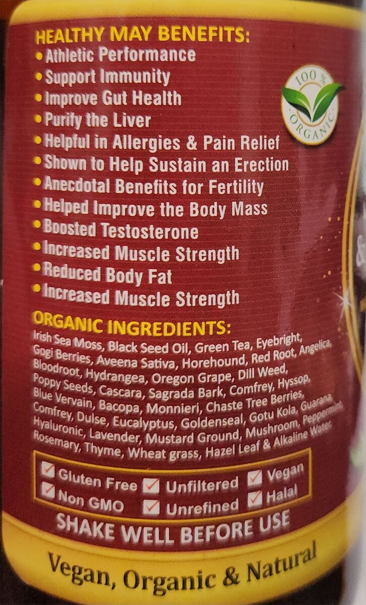 A plant-based liquid herbal blend made with sea moss, black seed oil, green tea, and a variety of traditional botanicals. Crafted for those seeking a natural addition to their daily wellness routine. Unfiltered and unrefined to help preserve the natural character of the herbs.