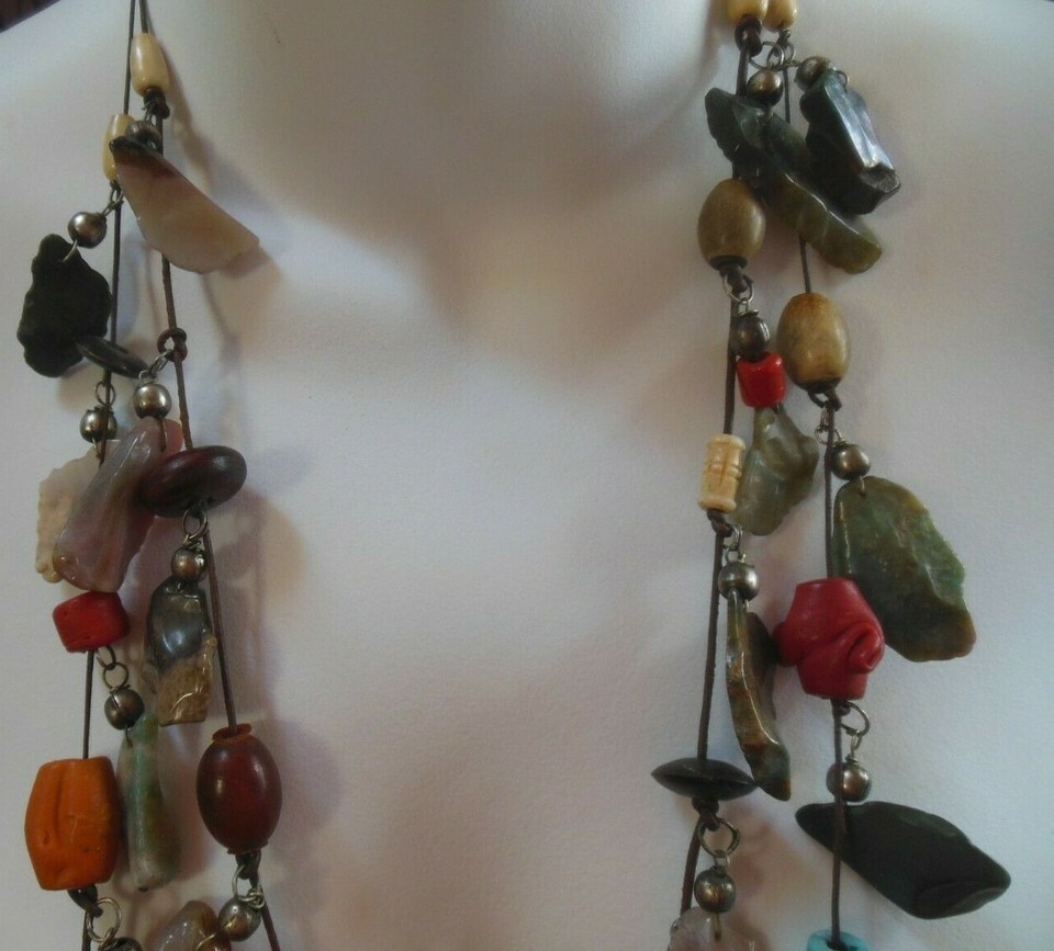 Double Strand Long Multi-color Stone/Bead Trade Beads on Leather Cord 36" long