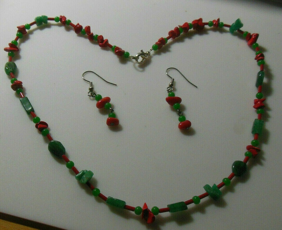 Women's Green Agate, Aventurine & Coral Bead Necklace & Earrings