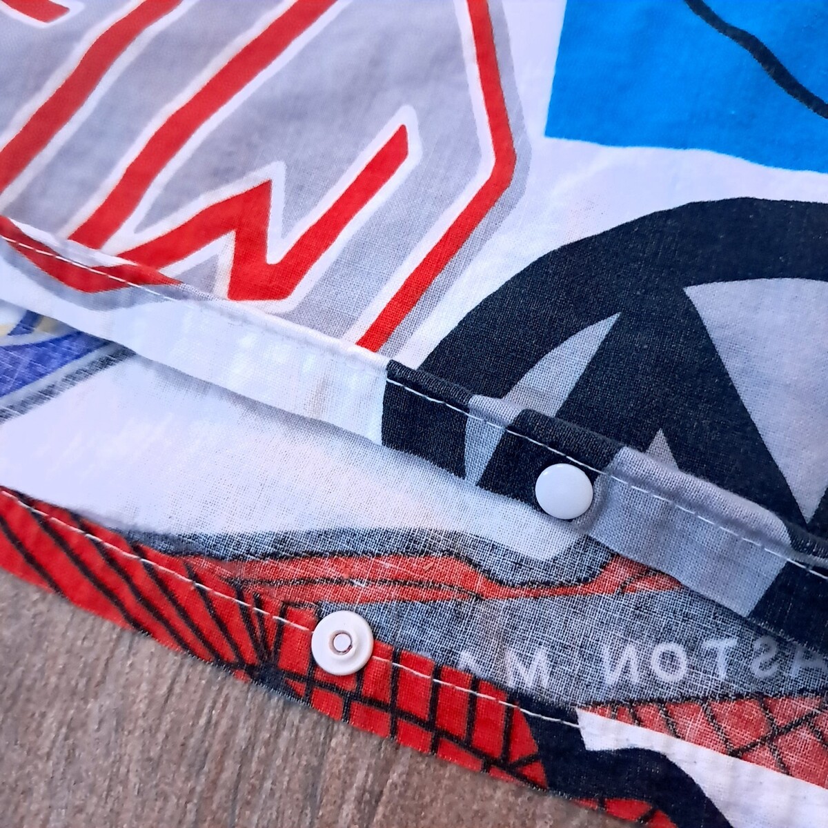 Some stains/color runs/wear as shown. Name written at the top in marker. Snaps at the bottom.