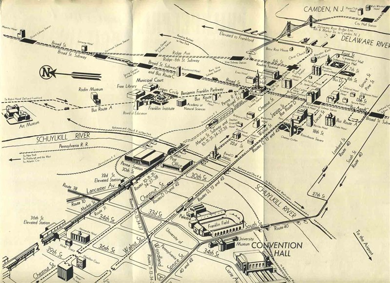 There are 2 different brochures in this lot from The Philadelphia Convention Tourist Bureau. There is a 16 panel fold out Glimpses of Things to See in Modern Historical Philadelphia. With ,many photos, historical information, small map, where to Shop, Hotels and much more. Plus an 8 panel fold out of Things to See and Do in Philadelphia with a large map, information on history, Education and Industry. And lots of photos of places of interest.