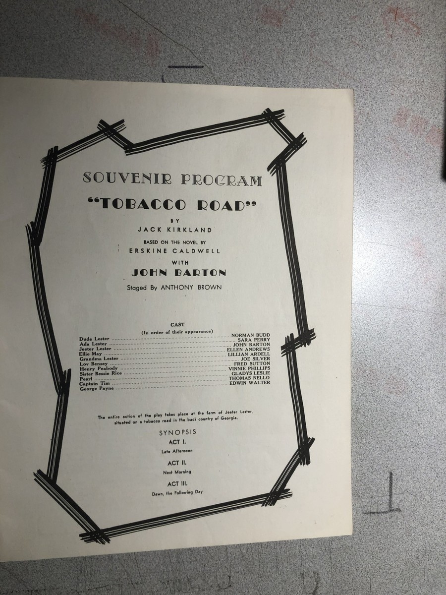 TOBACCO ROAD featuring John Barton vintage (1942) 16-page theatre program