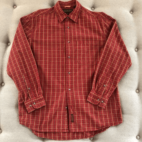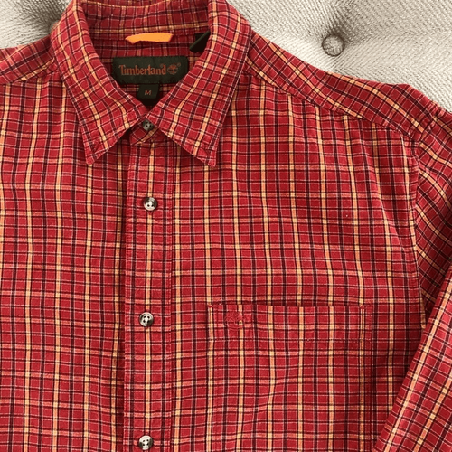 Timberland button down shirt with button down collar in fall color palette including rust and burnt orange. Branding at the tail. 100% cotton. Laying flat measures 30 inches from shoulder to hem and 23 inches from armpit to armpit