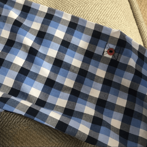 No retreat large check plaid button up shirt in shades of blue with white and roll tab sleeves