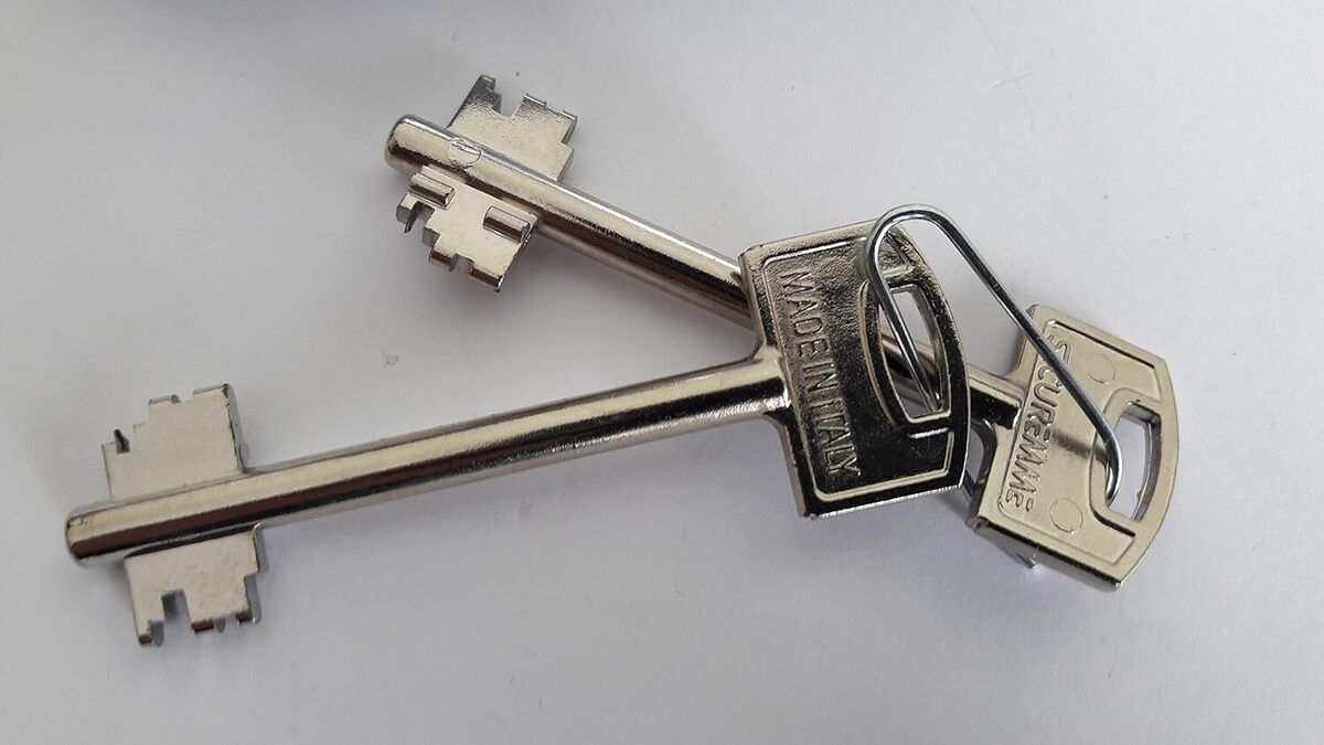 About this item Lateral double ward lock 6 levers for little safe. Chromium-plated steel bolt with three pistons O 10 mm. 2 keys, with rosettes and strike 2 flips, in the unlocked position switch remains in the lock.