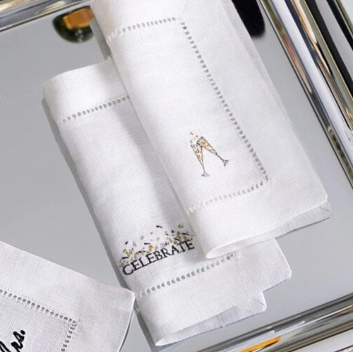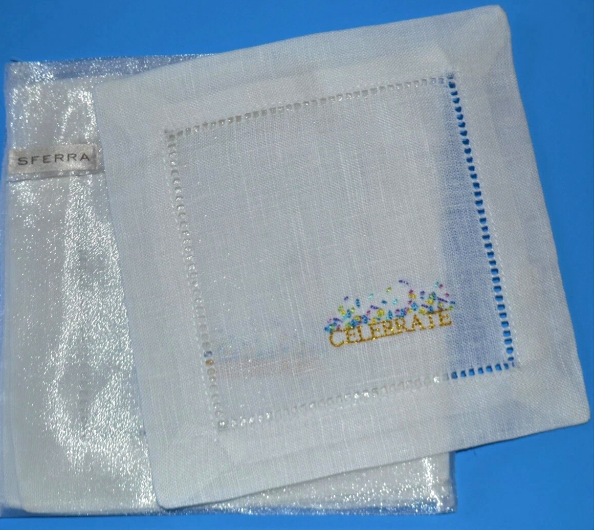 Sferra CELEBRATE Embroidered Cocktail Napkins 6x6" Hemstitched Linen SET/4 New
