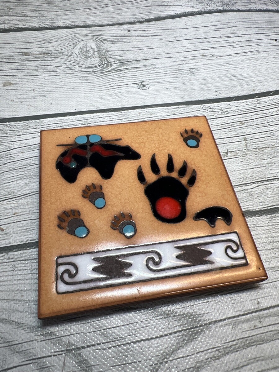 This vintage handcrafted ceramic art tile trivet coaster by Masterworks features a unique bear claw design in a square shape, measuring 4 x 4 inches. The multicolor trivet is inspired by Southwestern style and originates from the United States, making it a charming addition to any kitchen or home decor. Its original design and quality craftsmanship make it a standout piece for collectors or those looking to add a touch of Southwest theme to their space.