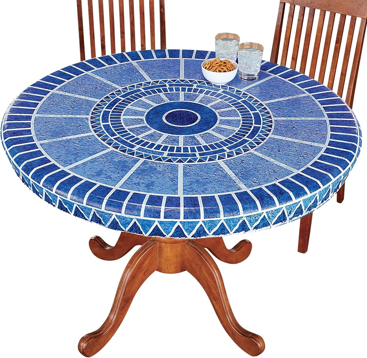 Transform, protect and decorate your table with this mosaic design table cover that stretches for a perfect fit for your indoor or outdoor table, the cover protects from spills and dust while the wide elasticized edge holds it securely in place. Fits tables from 36" - 48"Dia. Wipe clean.