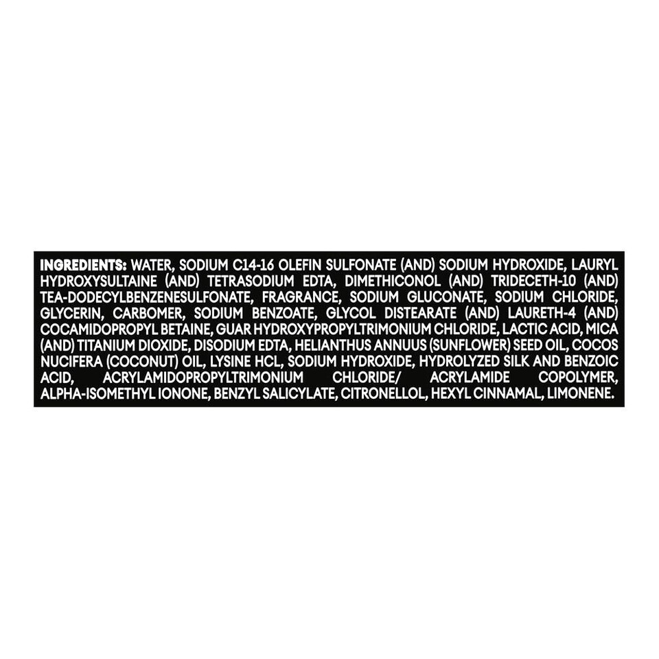 WATER, SODIUM C14-16 OLEFIN SULFONATE (AND) SODIUM HYDROXIDE, LAURYL HYDROXYSULTAINE (AND) TETRASODIUM EDTA, DIMETHICONOL (AND) TRIDECETH-10 (AND) TEA-DODECYLBENZENESULFONATE, FRAGRANCE, SODIUM GLUCONATE, SODIUM CHLORIDE, GLYCERIN, CARBOMER,SODIUM BENZOATE, GLYCOL DISTEARATE (AND) LAURETH-4 (AND) COCAMIDOPROPYL BETAINE, GUAR HYDROXYPROPYLTRIMONIUM CHLORIDE, LACTIC ACID, MICA (AND) TITANIUM DIOXIDE, DISODIUM EDTA, HELIANTHUS ANNUUS (SUNFLOWER) SEED OIL, COCOS NUCIFERA (COCONUT) OIL, LYSINE HCL, SODIUM HYDROXIDE, HYDROLYZED SILK AND BENZOIC ACID, ACRYLAMIDOPROPYLTRIMONIUM CHLORIDE/ ACRYLAMIDE COPOLYMER, ALPHA-ISOMETHYLIONONE, BENZYL SALICYLATE, CITRONELLOL, HEXYL CINNAMAL, LIMONENE.