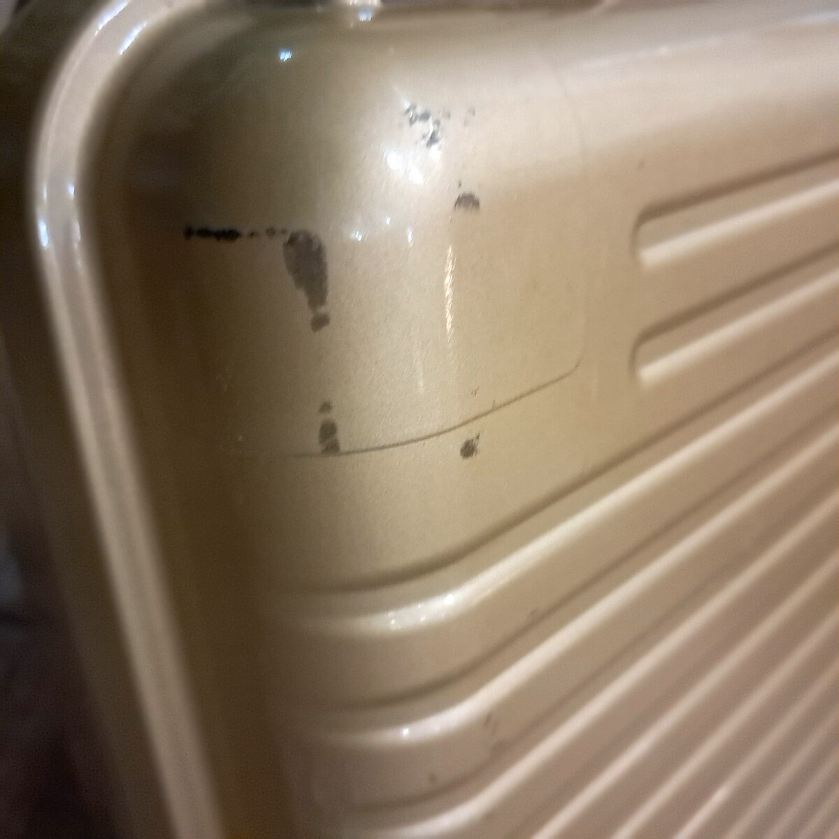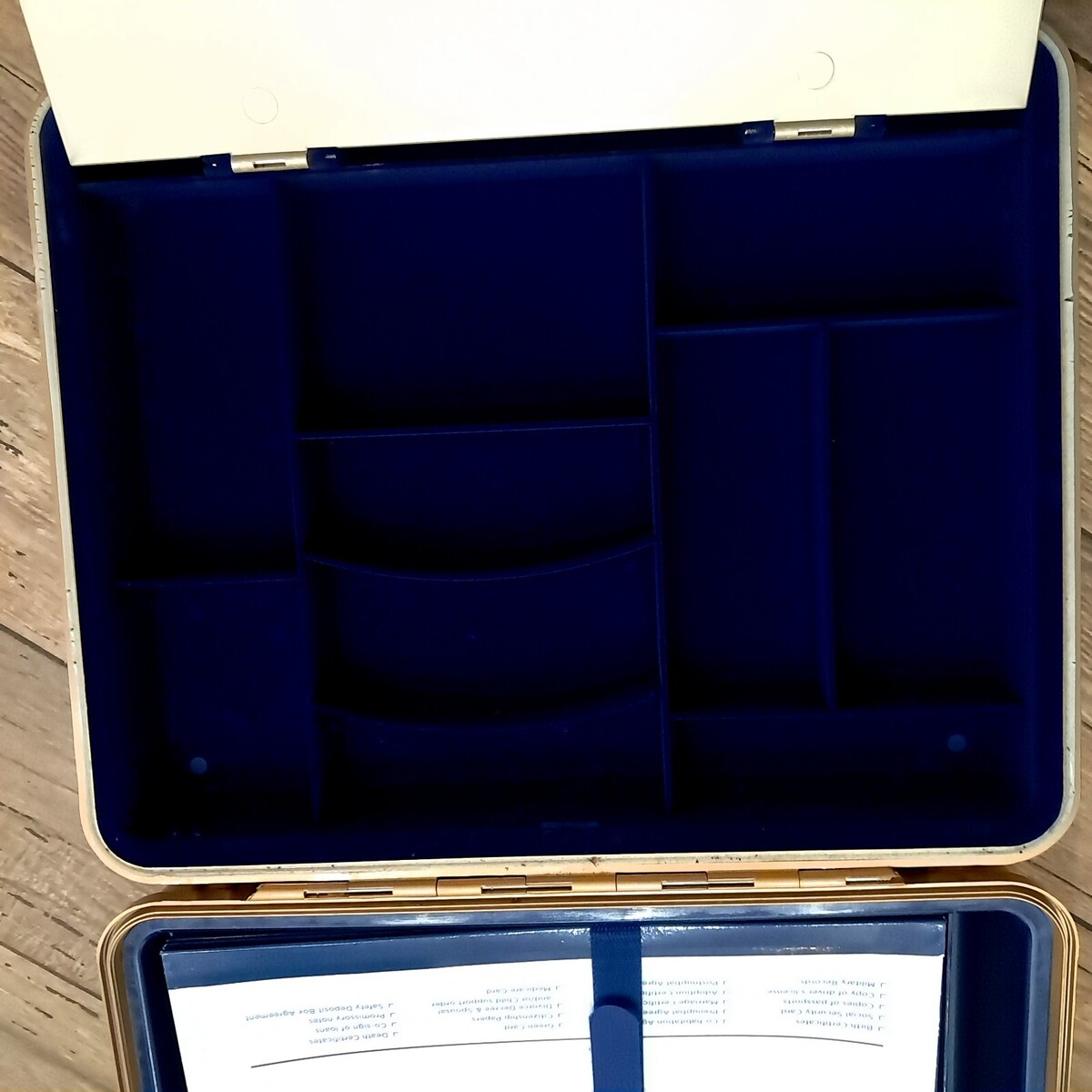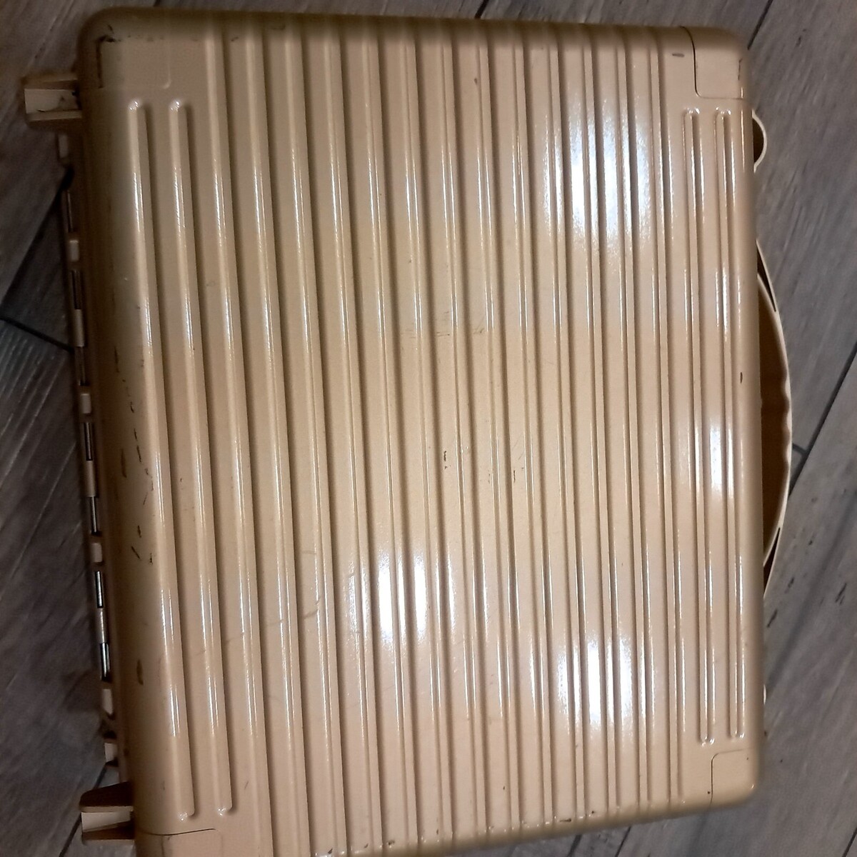 Includes parts shown only. Some paint wear/marks/wear as shown. May be missing pieces. See pics. Gold plastic briefcase with navy flocked velvet type lining.