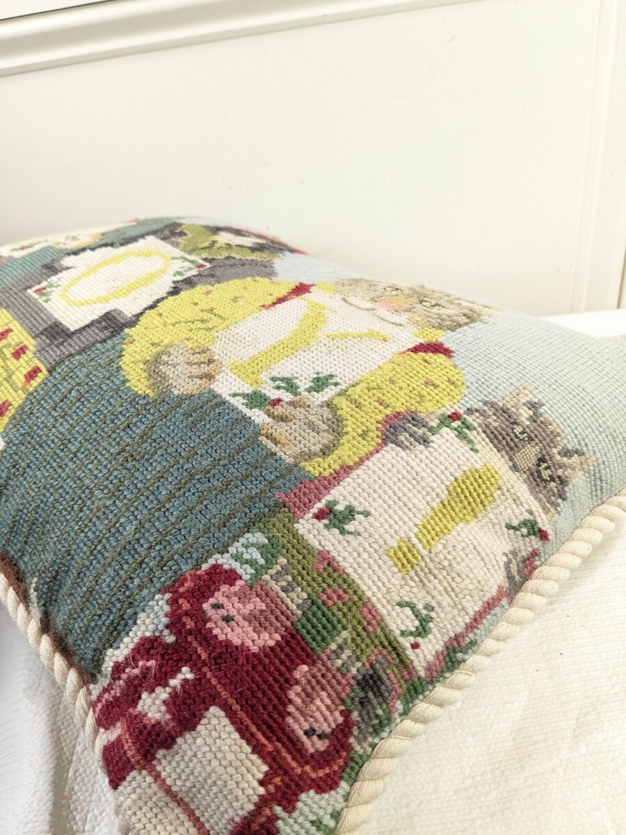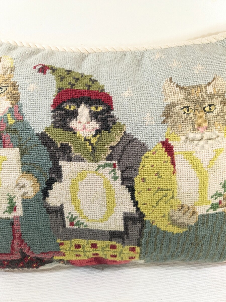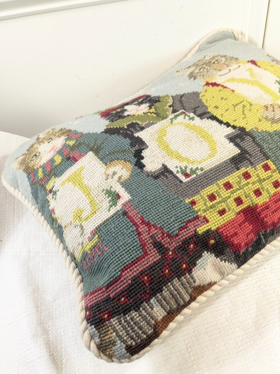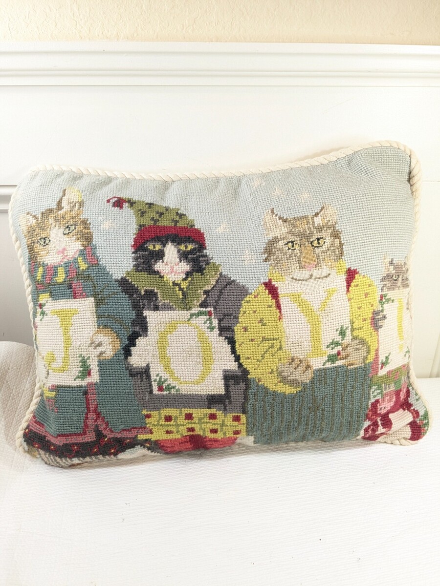 Vintage Cats in Snow Joy Needlepoint pillow Christmas decor throw PARIS BOTTMAN