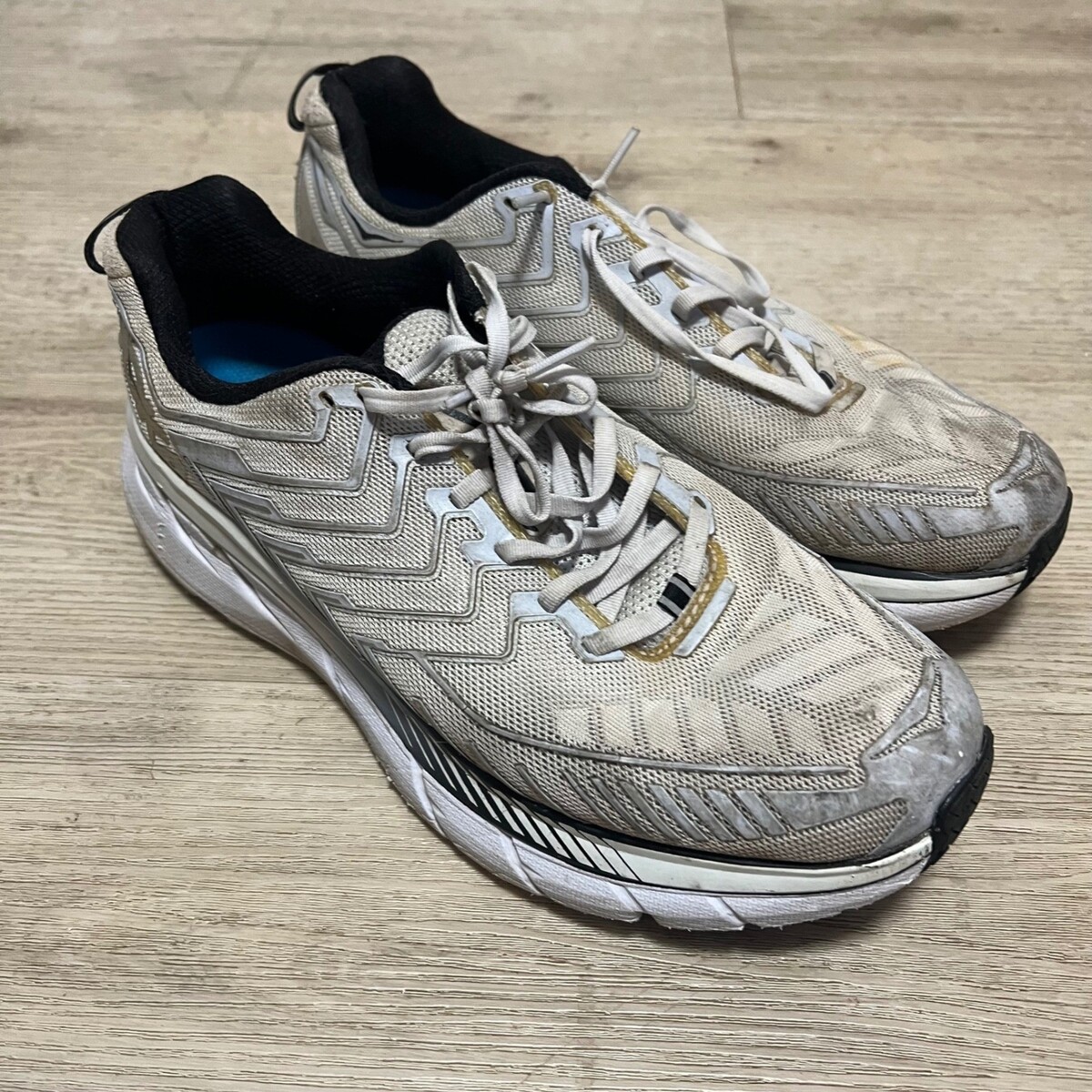 Keywords: Hoka One One, Clifton 4, Running Shoes, Mens Shoes, Athletic Shoes, Workout Shoes, Gray, White, Size 10, EU 44, Road Running, Training Shoes