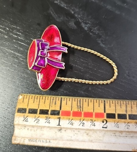This is a Red Hat Society themed brooch that doubles as an eyeglass holder pin. The brooch is made of gold-tone metal and features an enameled red hat with a purple bow. It is perfect for occasions related to the Red Hat Society.